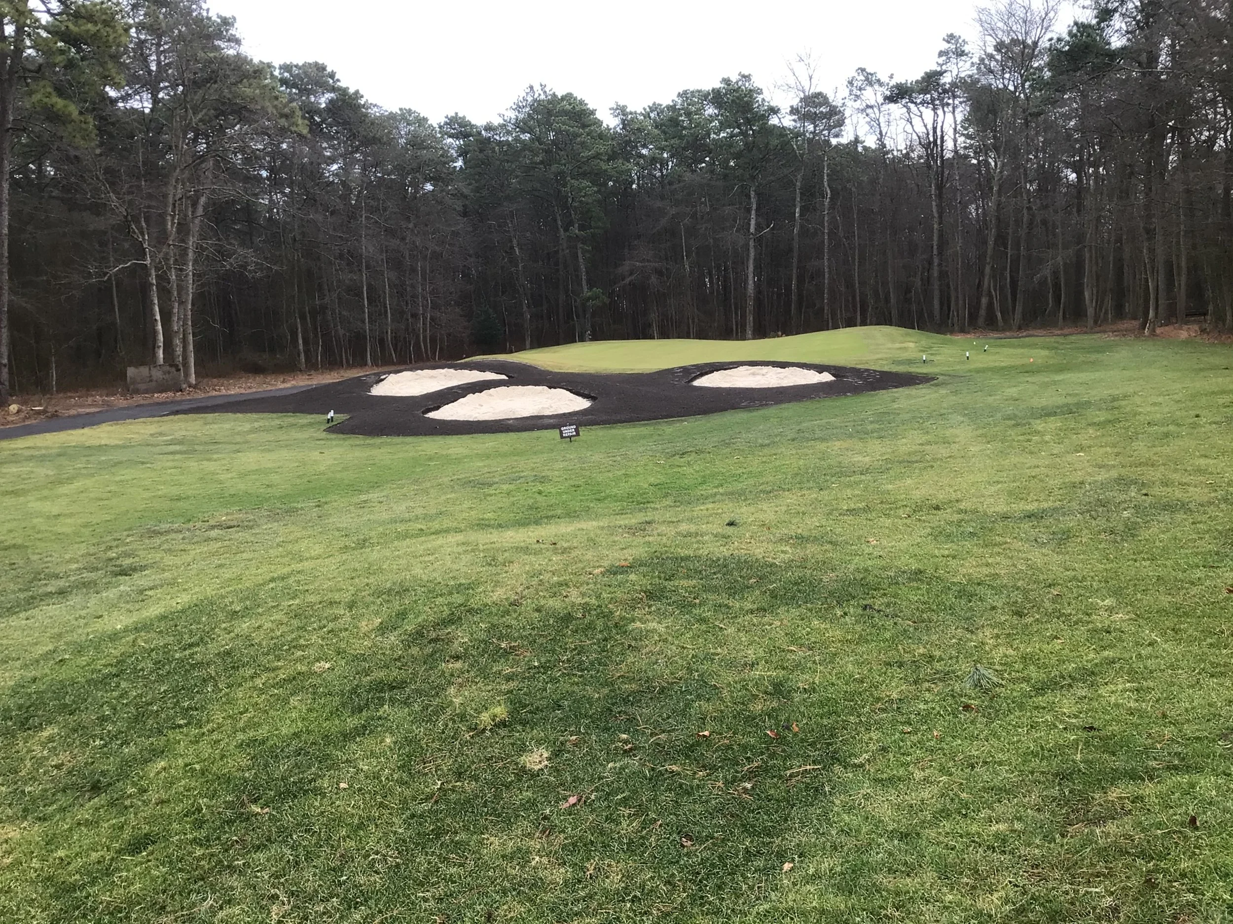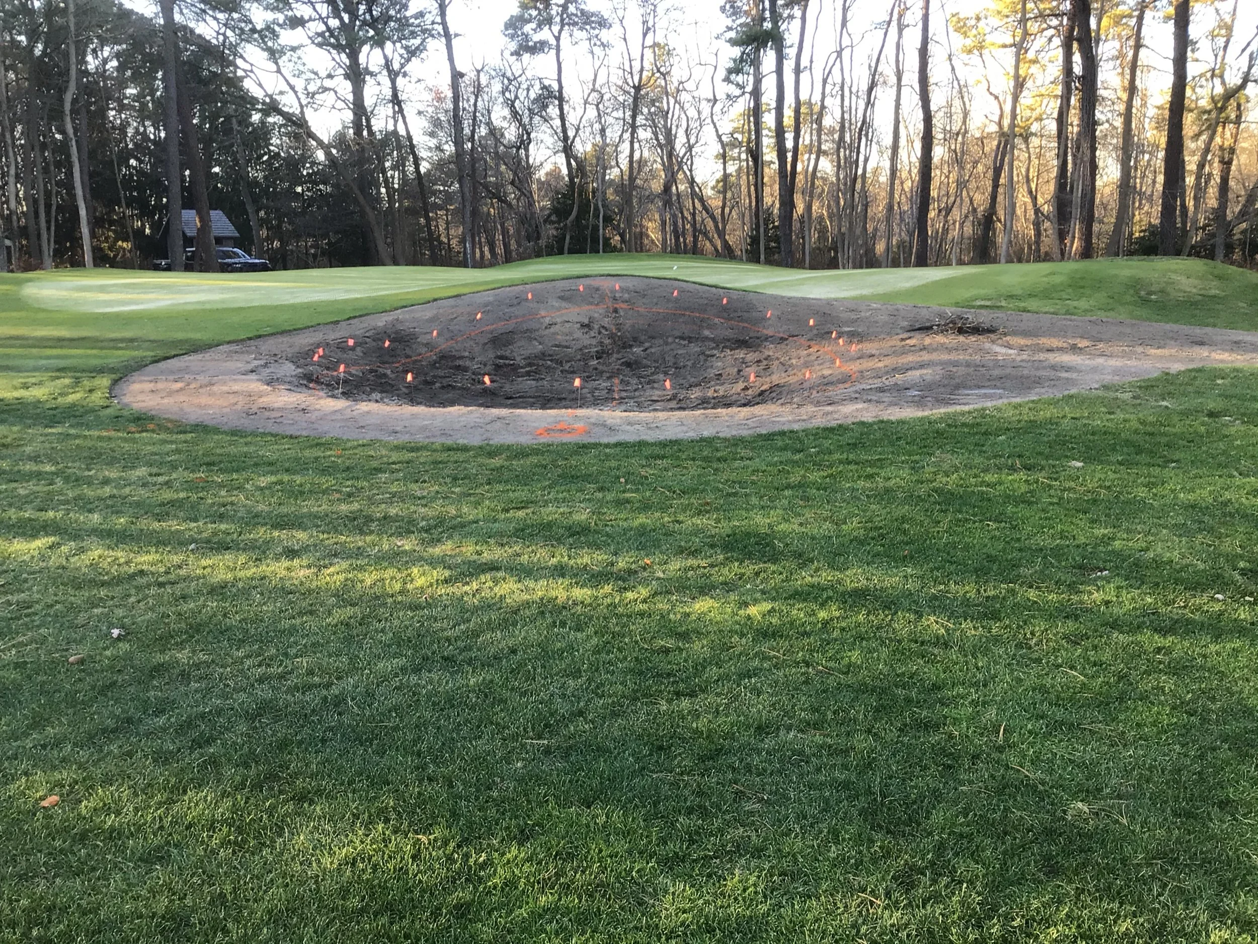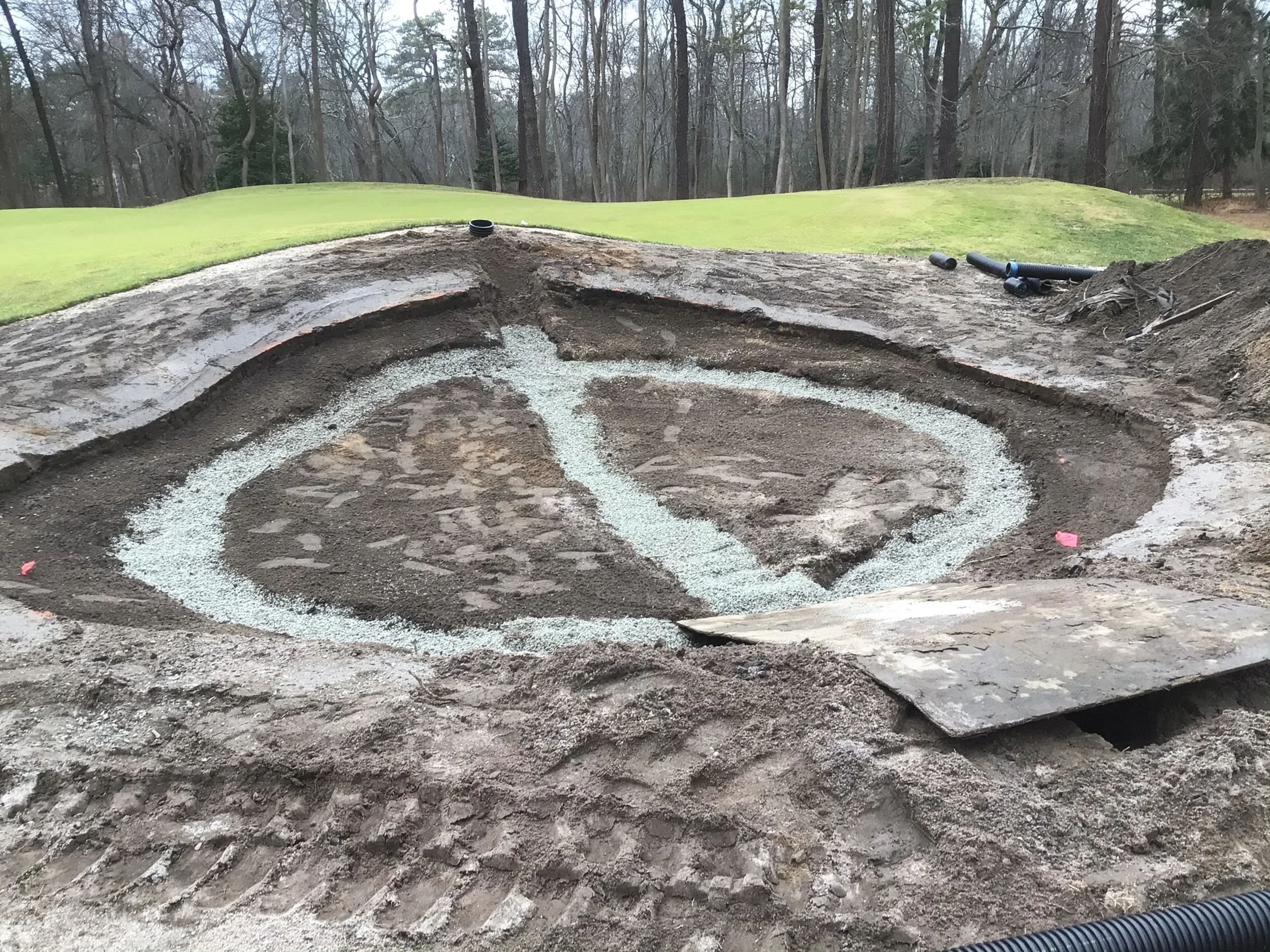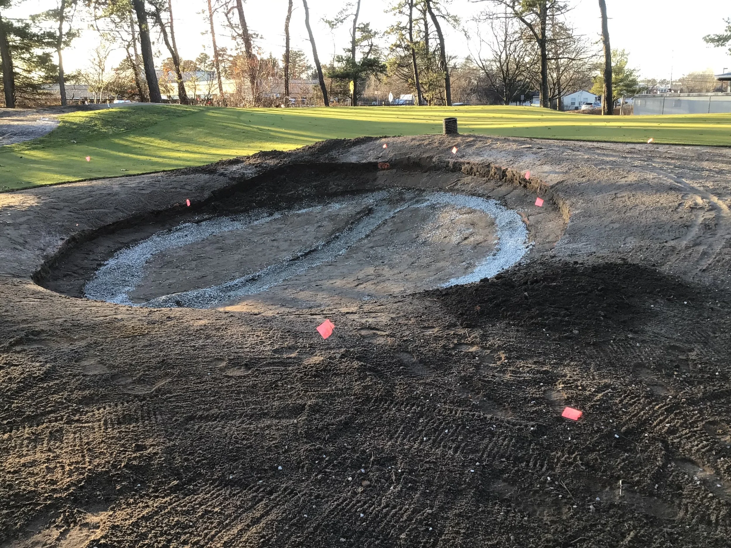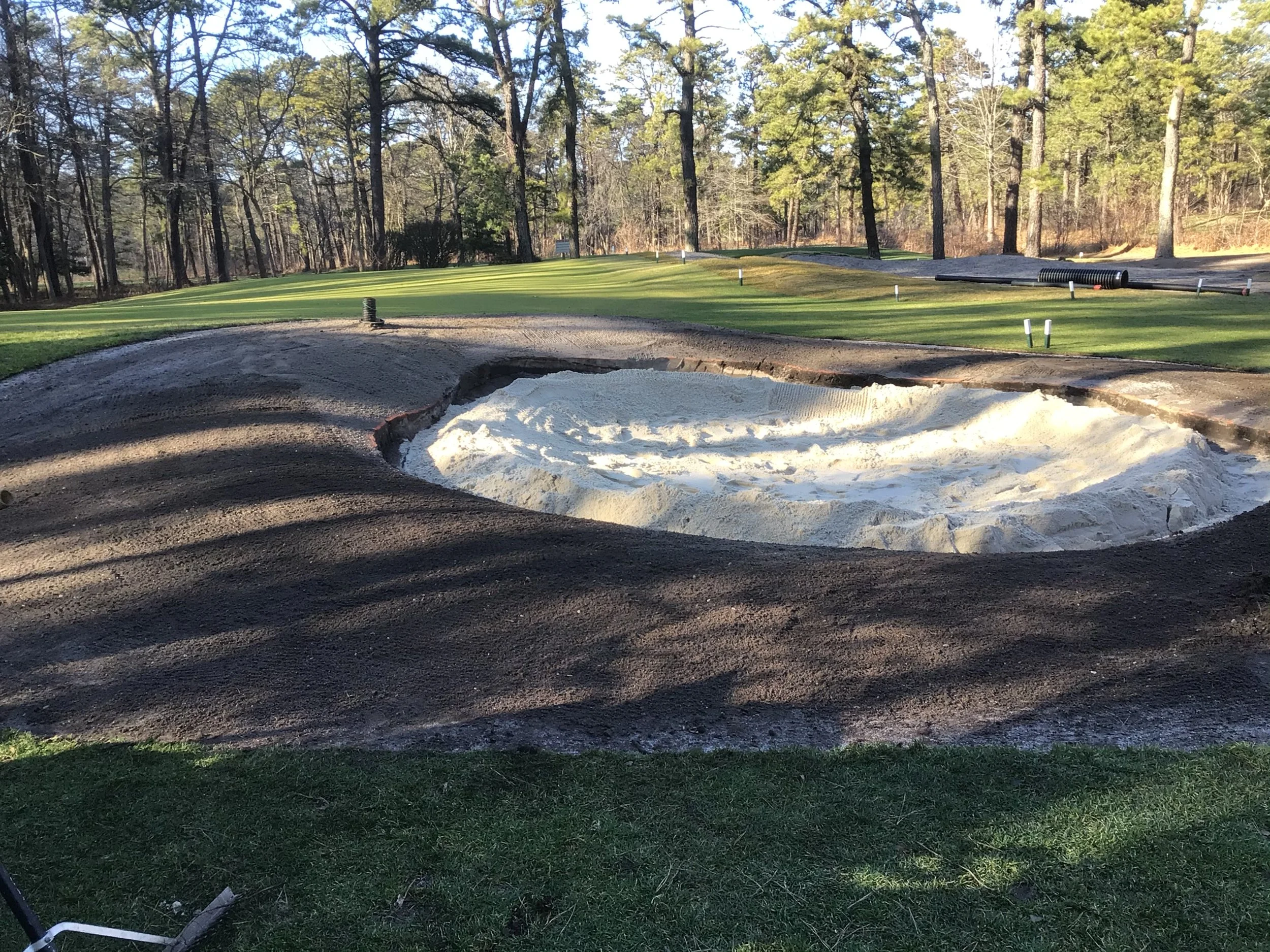 This project involved rebuilding ten sand bunkers and eliminating (converting) five sand bunkers in grass hollows. It also included installation of drainage and sodding.