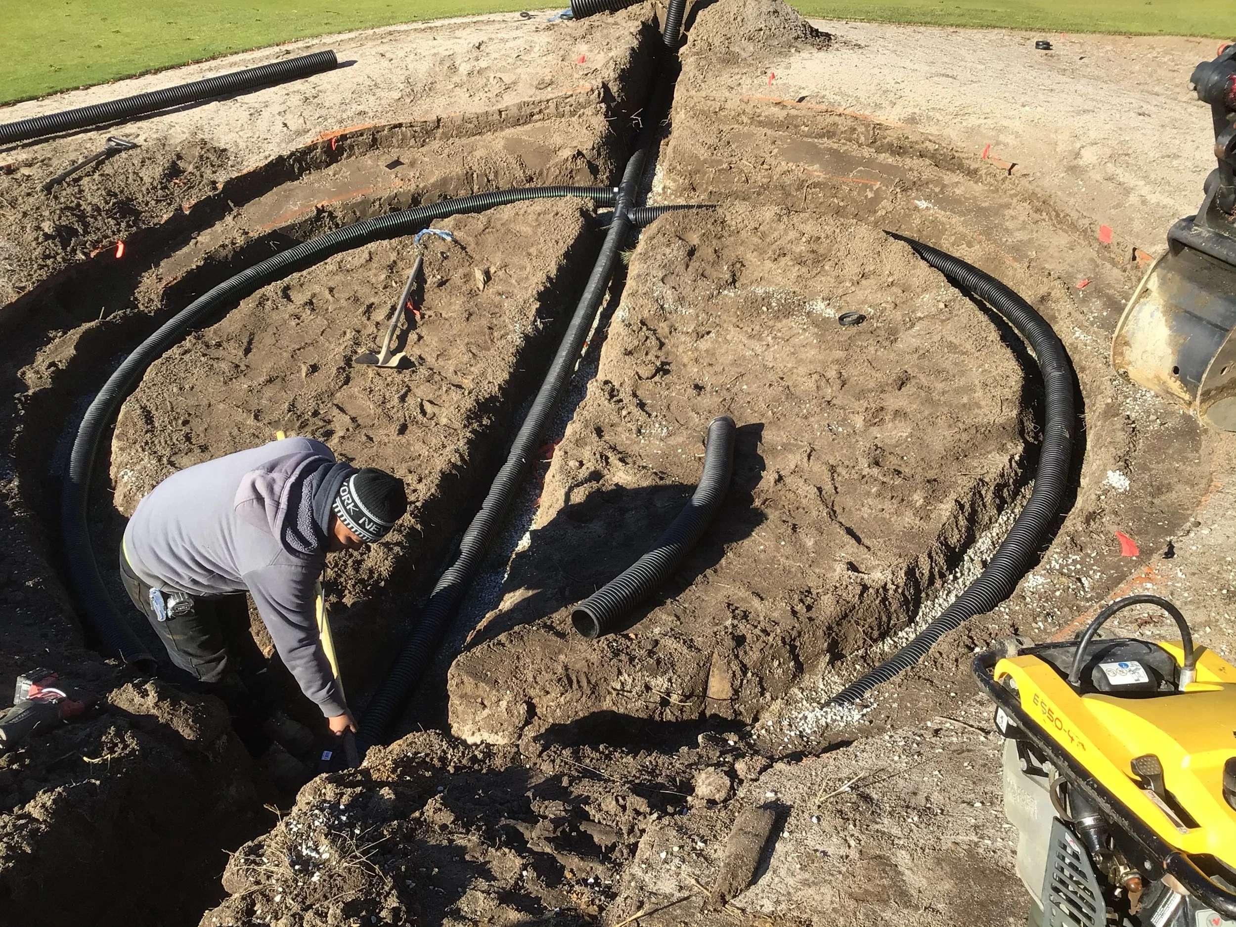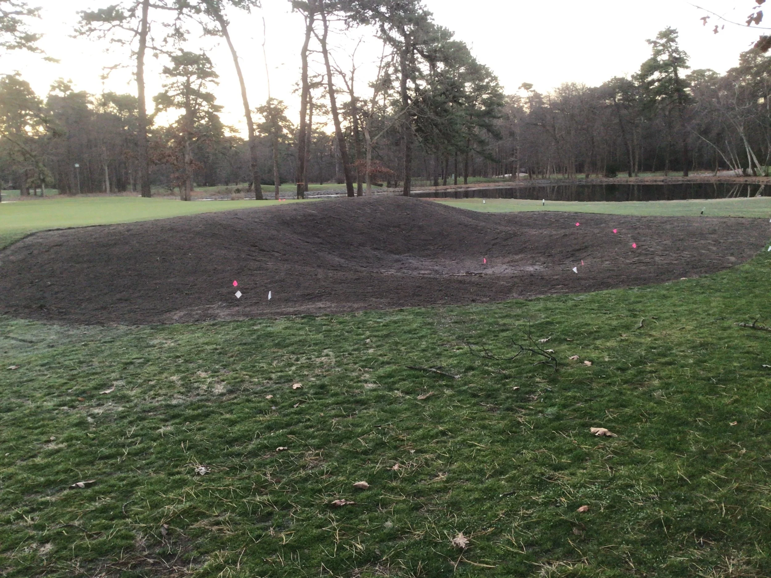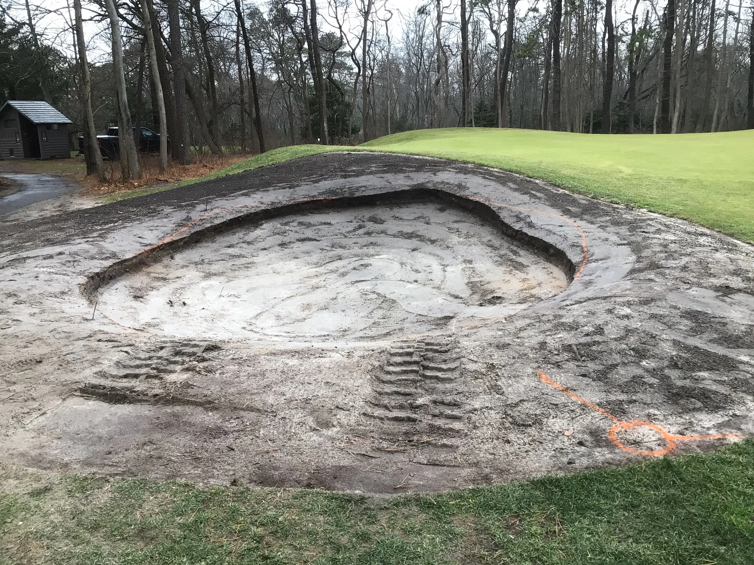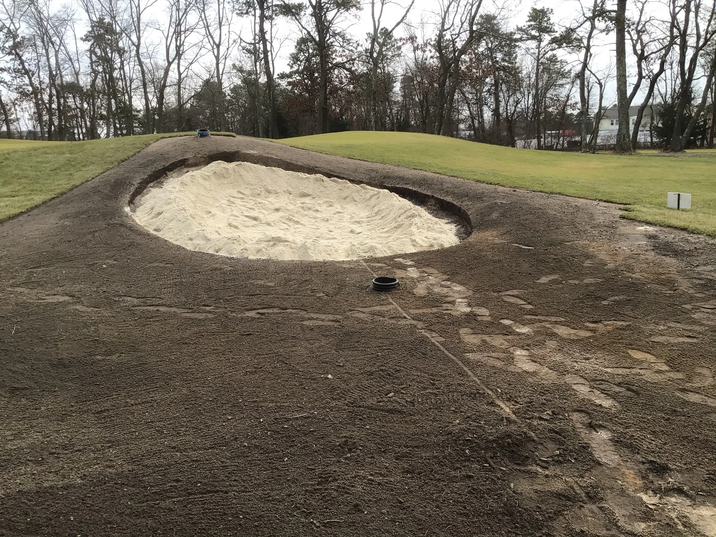 This project involved rebuilding ten sand bunkers and eliminating (converting) five sand bunkers in grass hollows. It also included installation of drainage and sodding.
