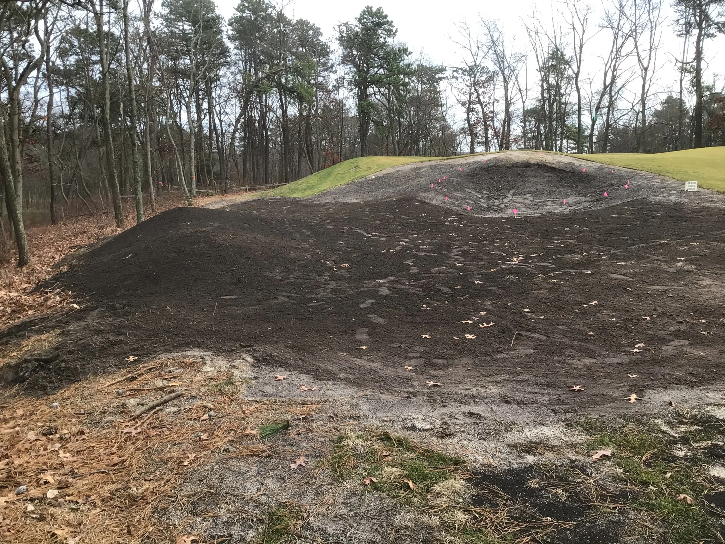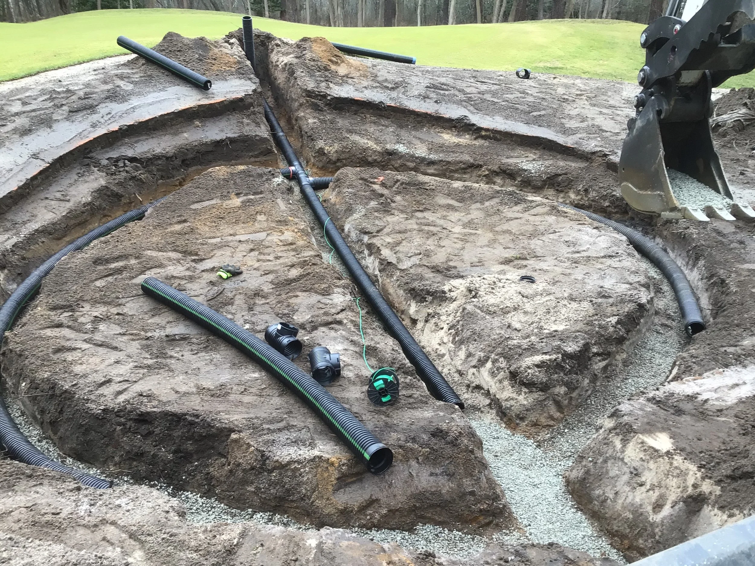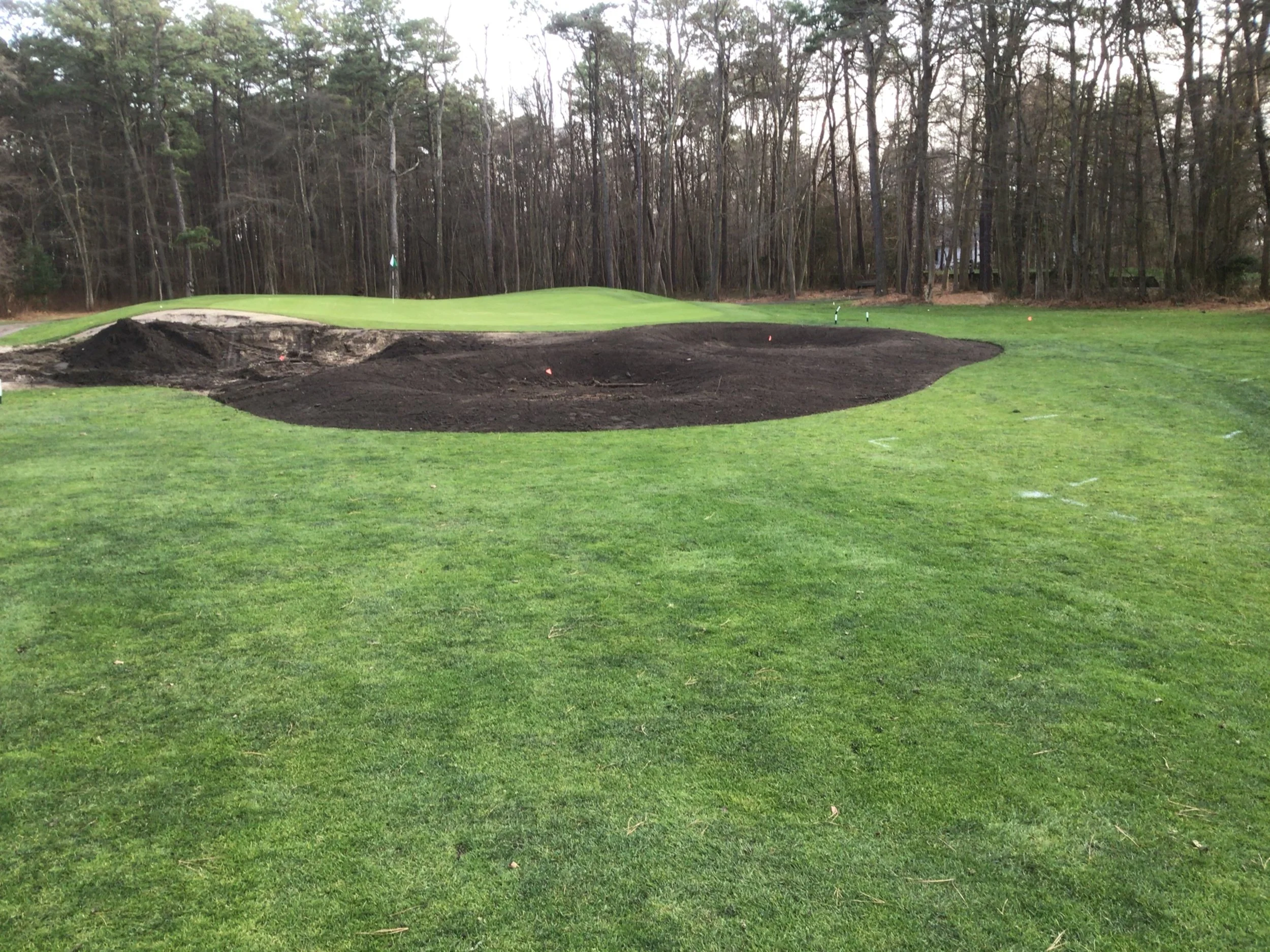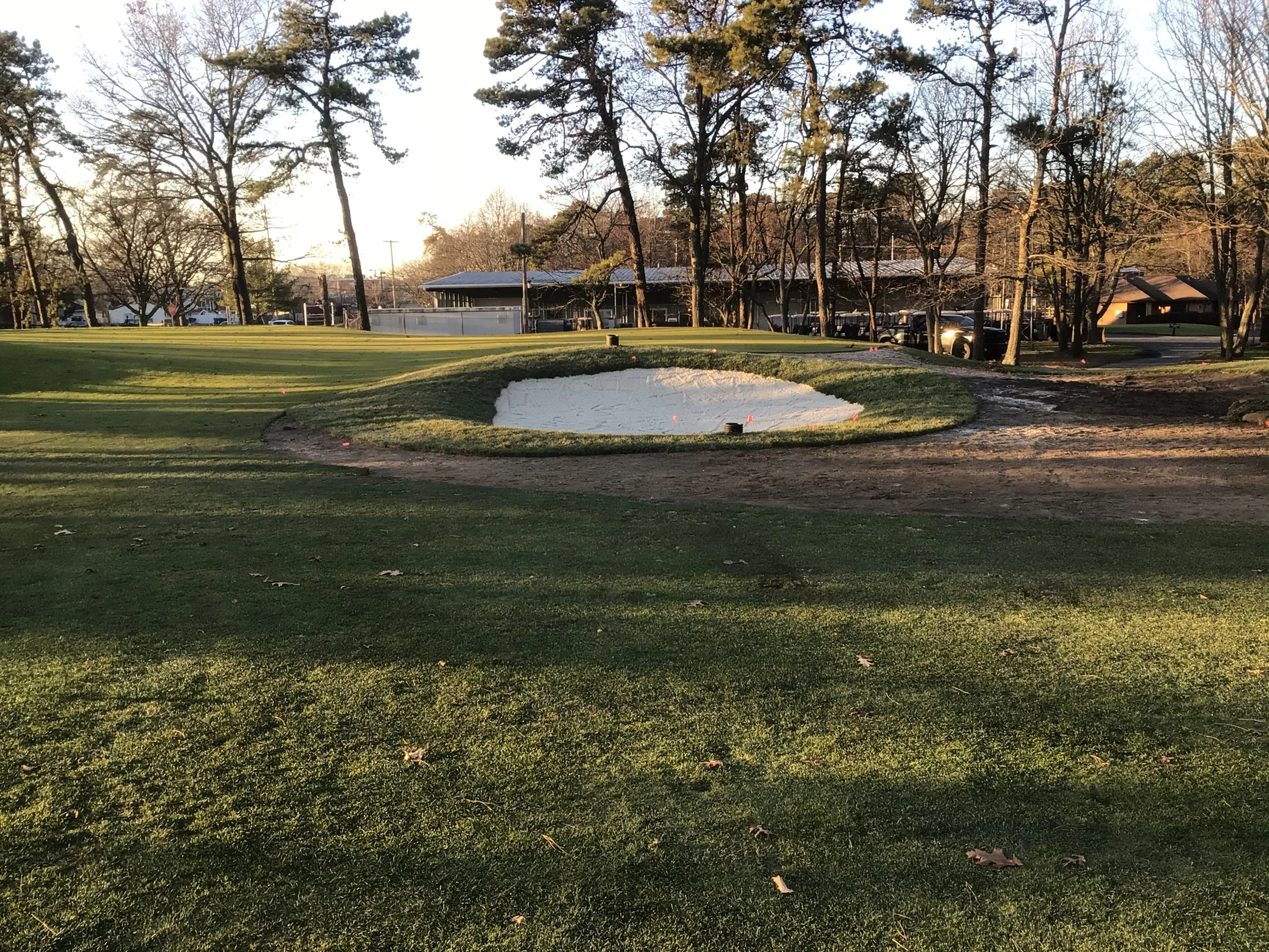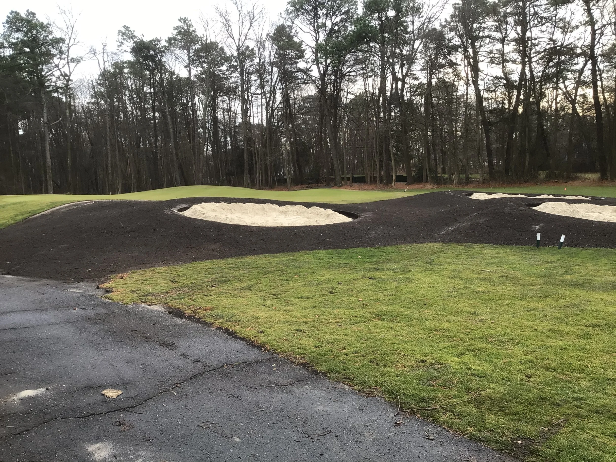 This project involved rebuilding ten sand bunkers and eliminating (converting) five sand bunkers in grass hollows. It also included installation of drainage and sodding.