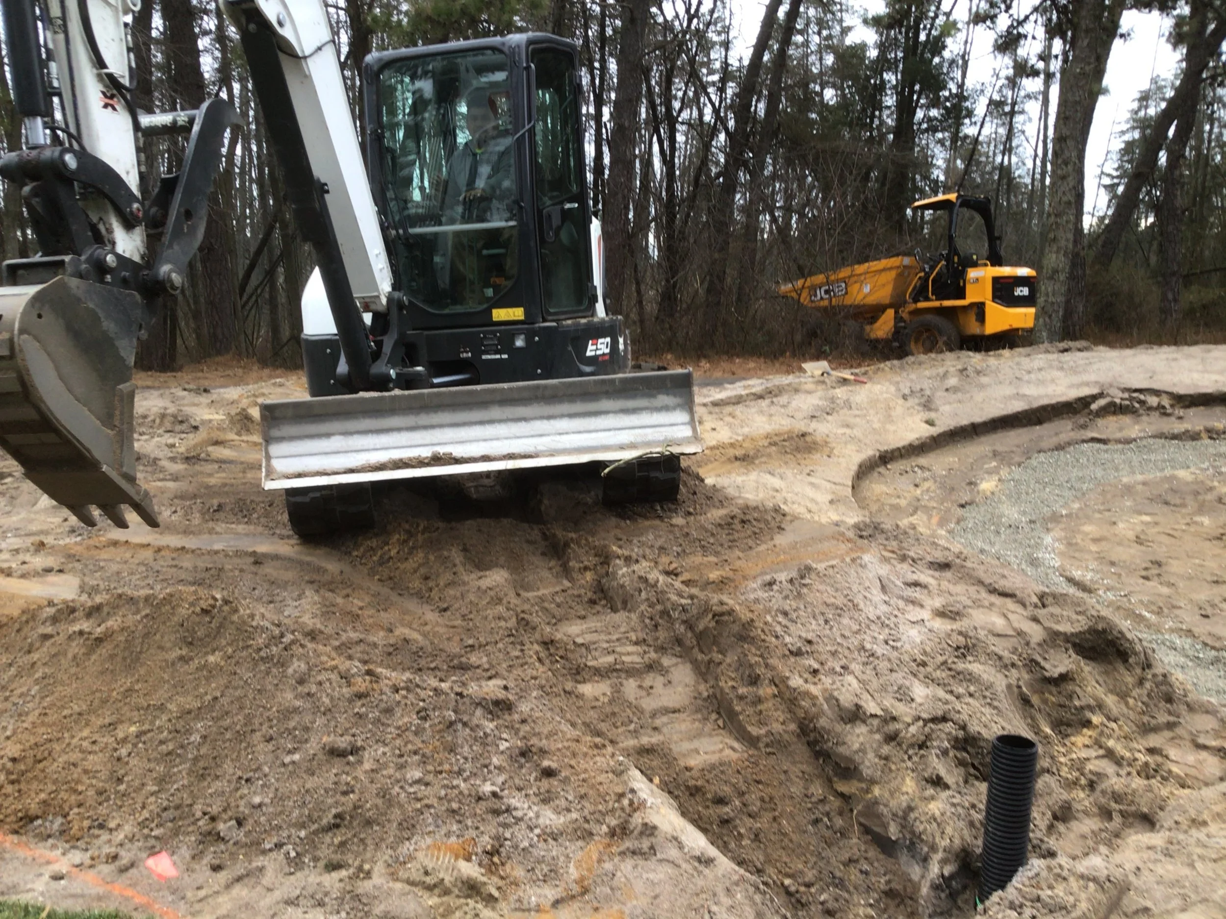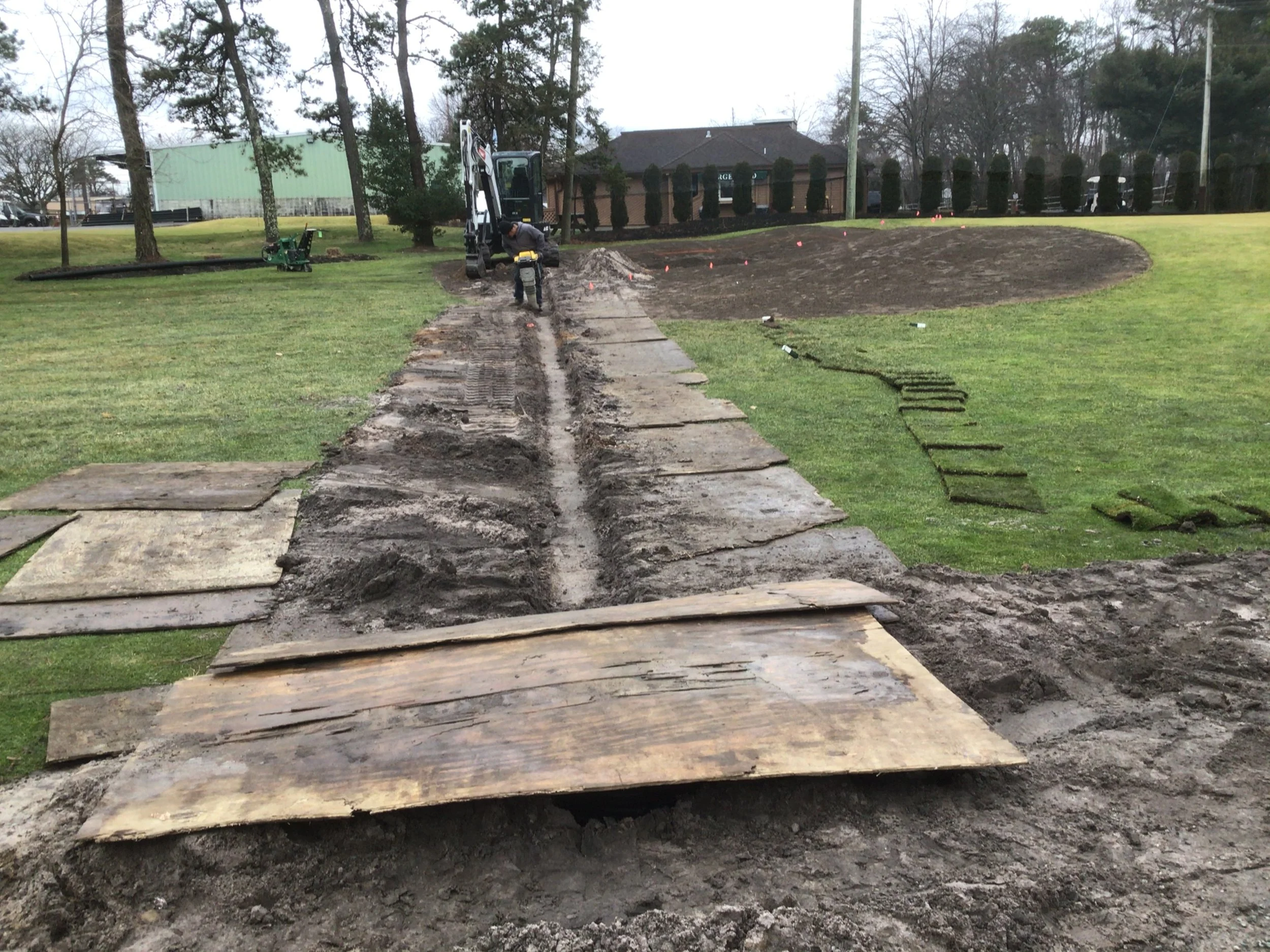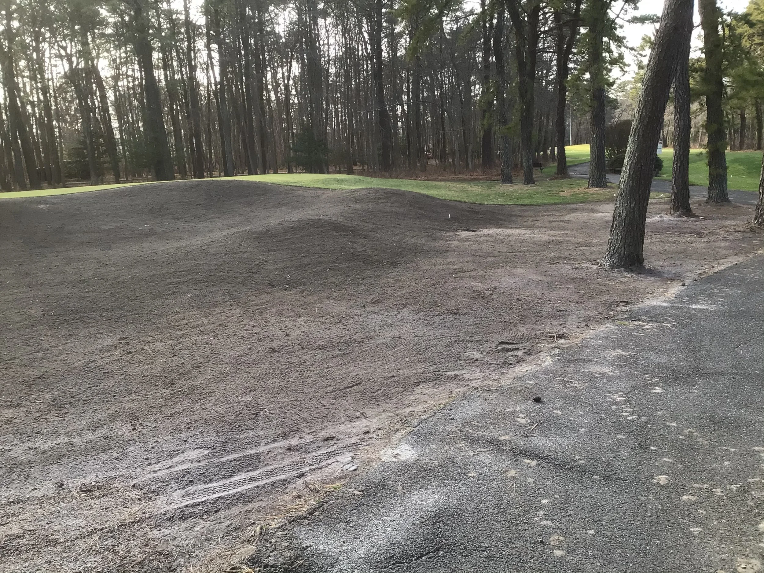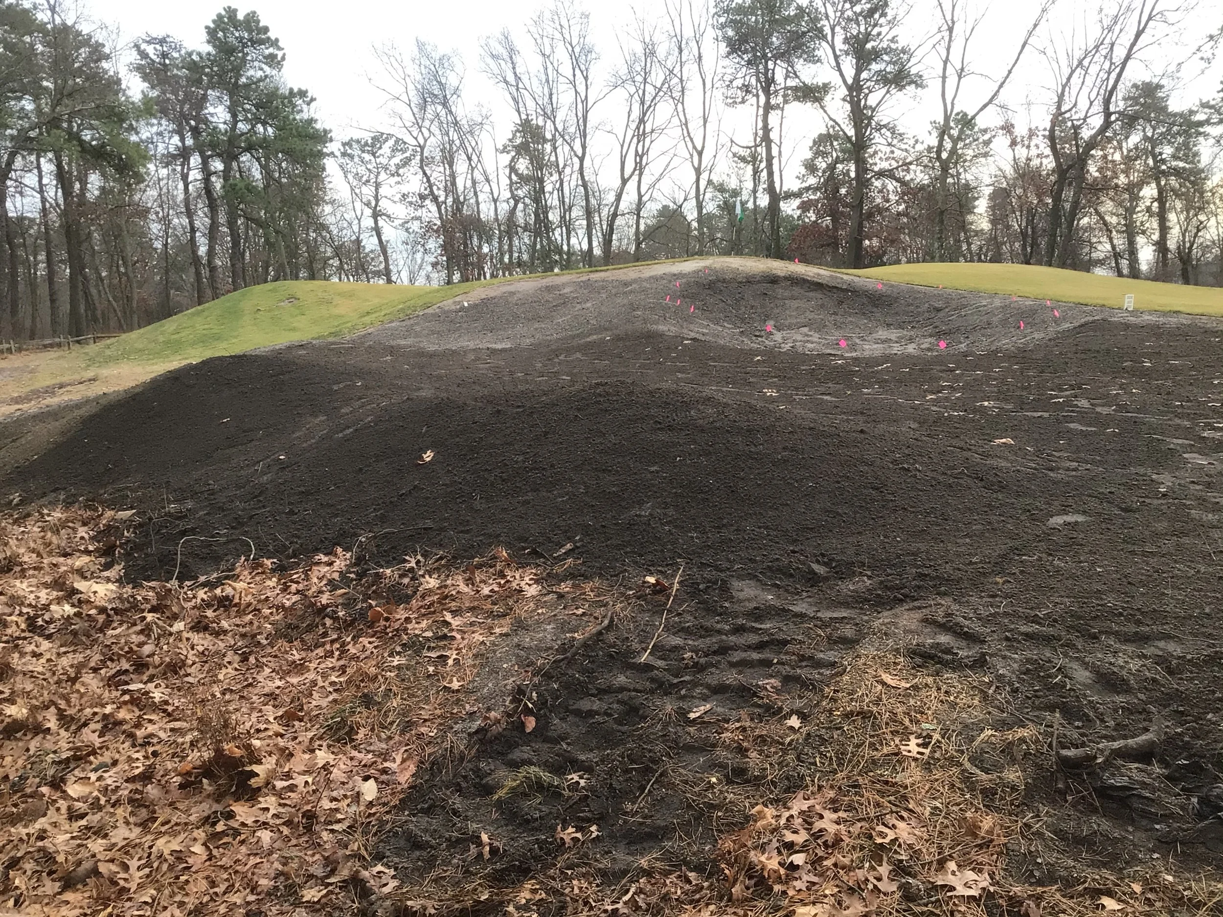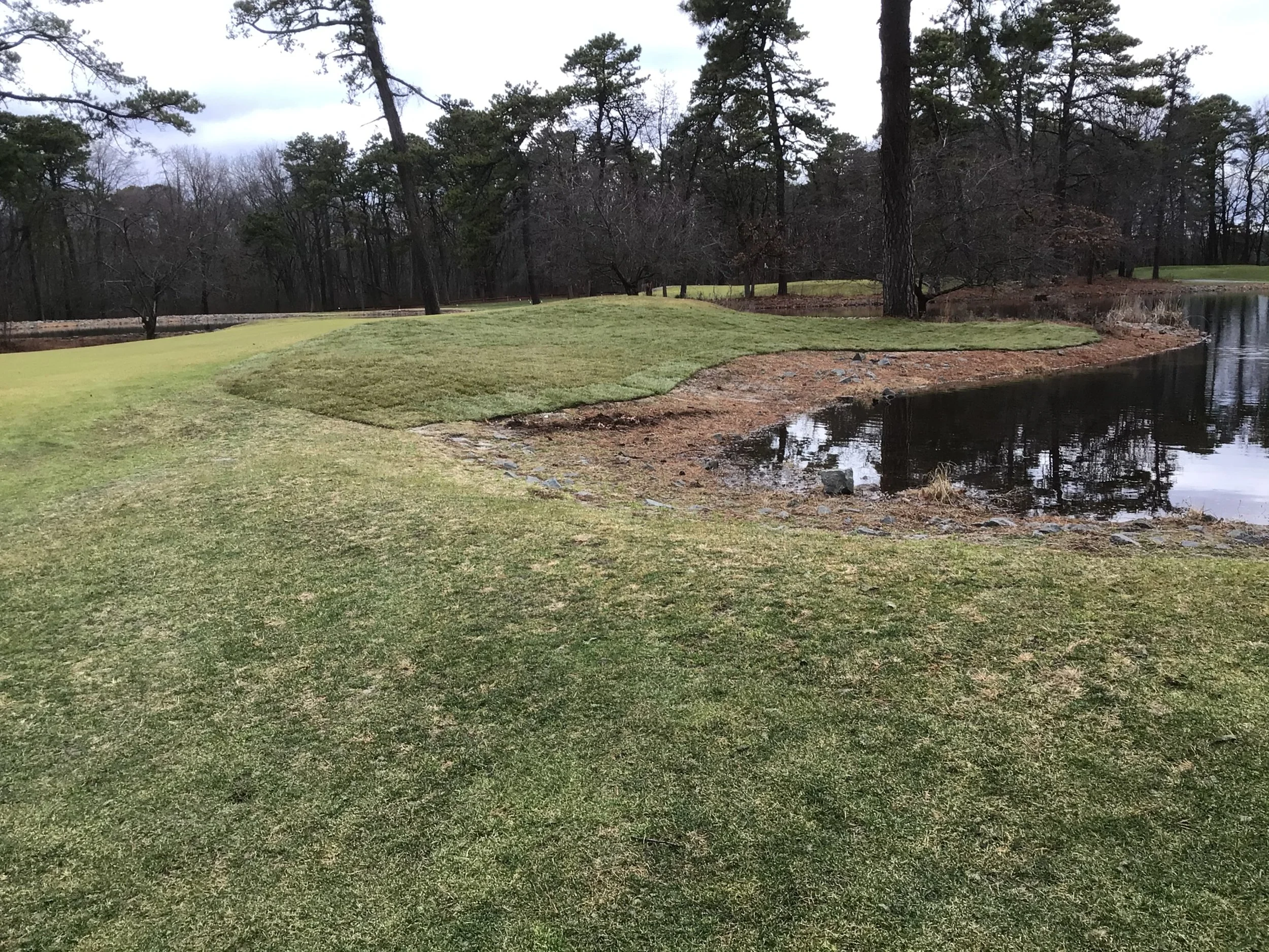 This project involved rebuilding ten sand bunkers and eliminating (converting) five sand bunkers in grass hollows. It also included installation of drainage and sodding.